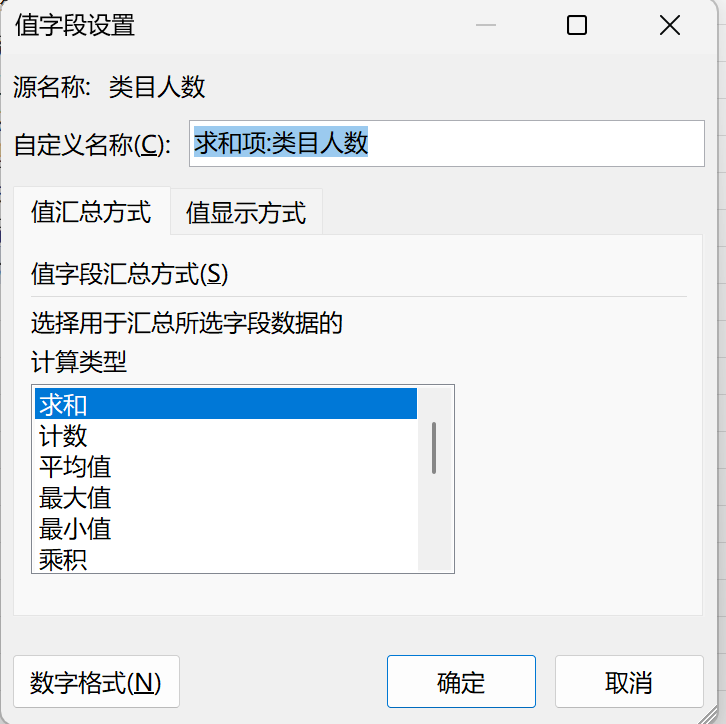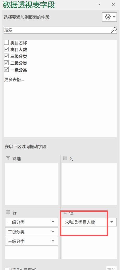 之后在数据透视表字段那里,将一级二级三级类目拖动到行位置,将类目人数拖动到值为止,并且选择【求和项】而不是【计数项】,如果默认是计数项,则改为求和项。