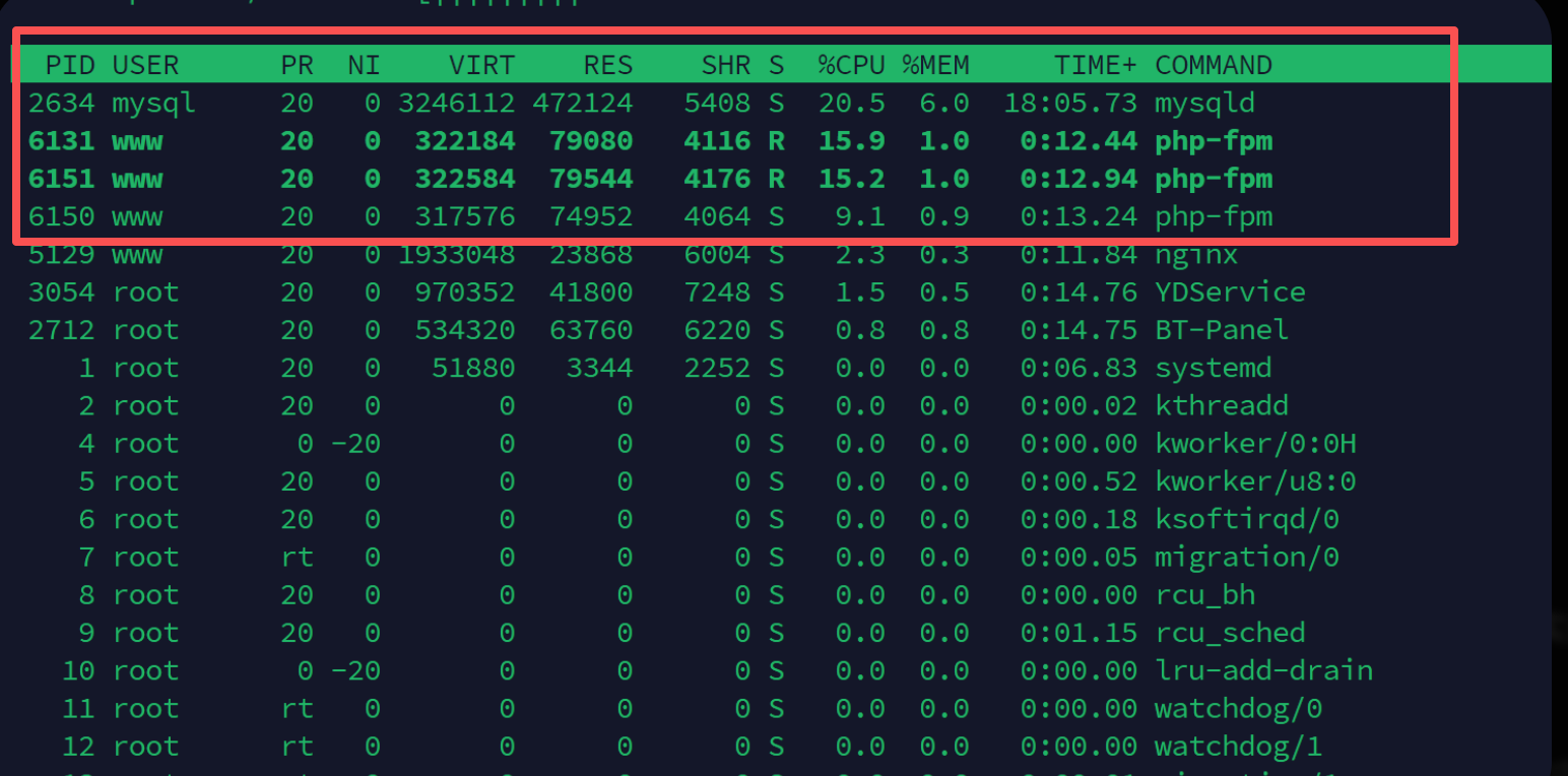 日志分析:检查系统日志和应用程序日志寻找异常原因ShellScript服务器是 CentOS,我让他先运行 top M 先看下高负载进程的情况,结果是 MySQL 和 PHP 进程比较占用资源。