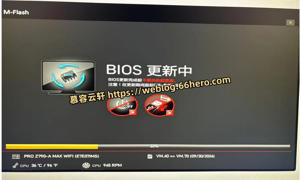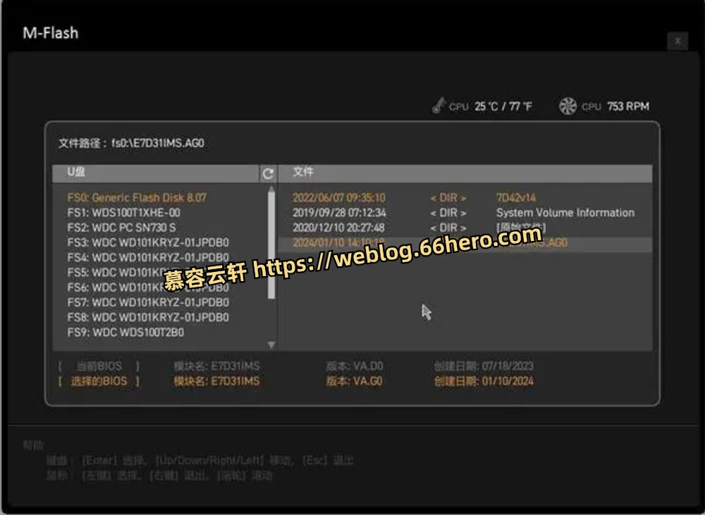 选择 M-FLASH 之后电脑会断电重启,之后进入 M-FLASH 界面,选择 U 盘,文件选择E7E07IMS.M70(这里我没有拍照),引用网上的一张图片吧: