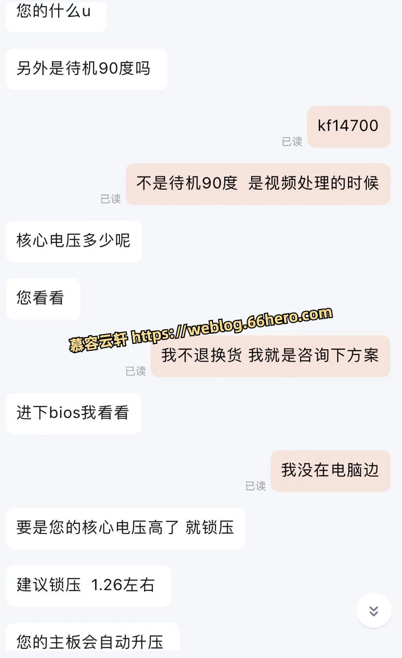 找了水冷散热器的售后咨询了一下这个情况,售后人员询问了我的 CPU 型号。我的 CPU 是 Intel 酷睿 i7 14700KF,售后人员让我在 BIOS 里面把核心电压设置在 1.26 左右。